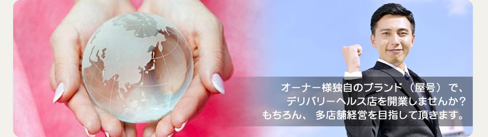 | 今回、「デリヘル開業グループ」が皆様にご提供させて頂くサービスは、オーナー様が考えた「独自屋号」でデリバリーヘルスをご開業していただき、多店舗経営を経て、その後、フランチャイズ展開できる(フランチャイズ本部の会長となれる)システムです。 |